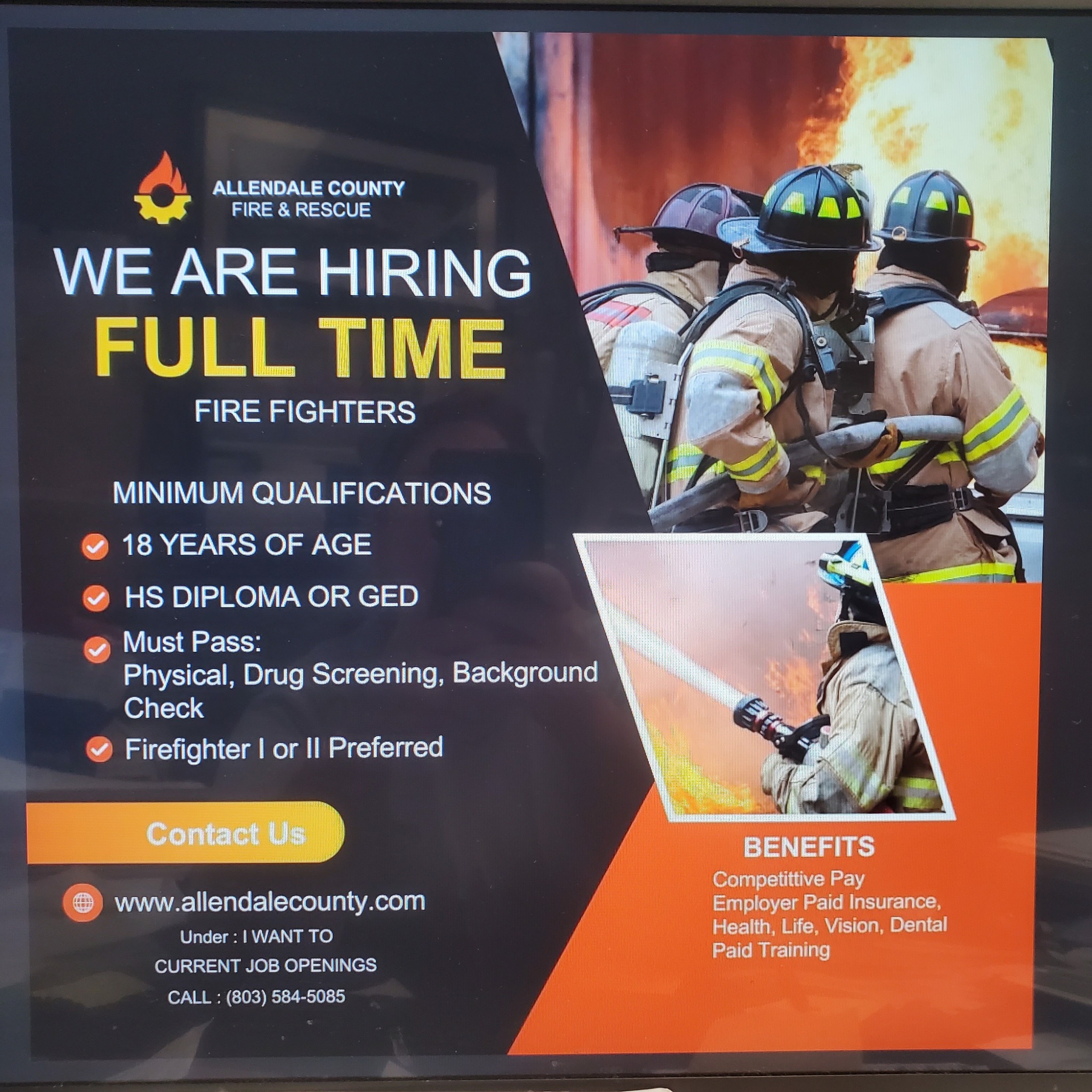 Allendale County Fire & Rescue is hiring and searching full-time firefighters. Minimum qualifications: 18…
