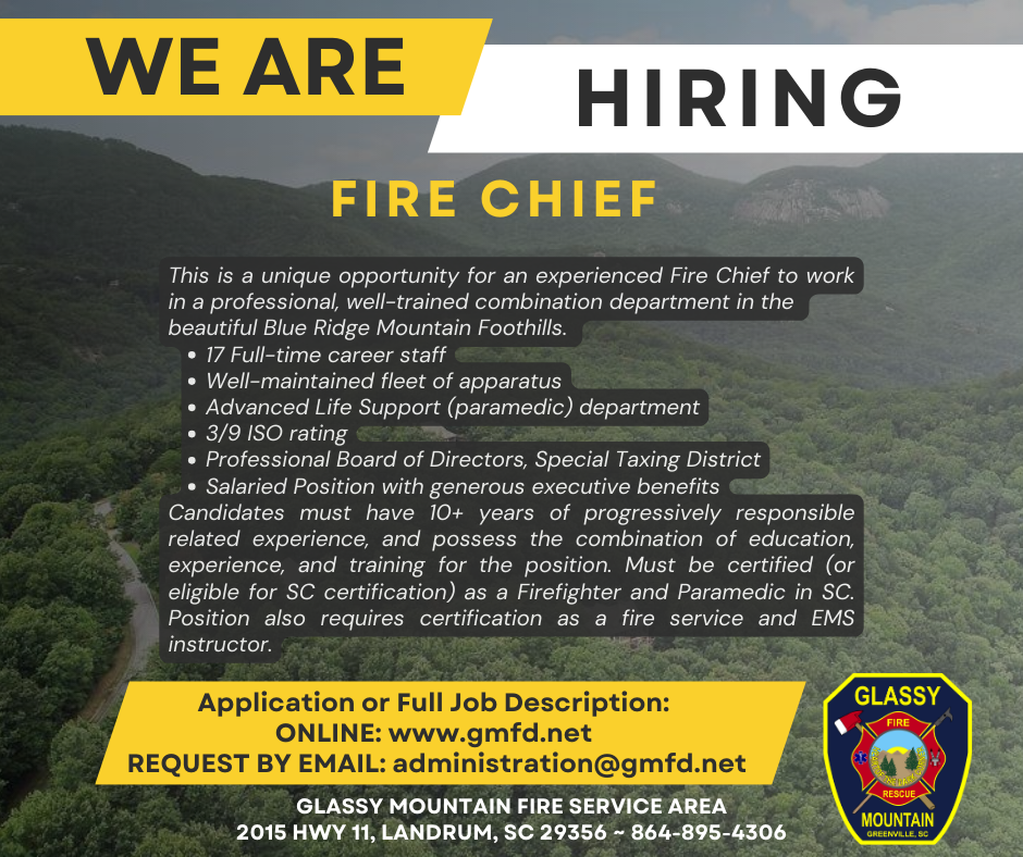The Glassy Mountain Fire Service Area (GMFSA) is seeking to hire a Fire Chief. Start…