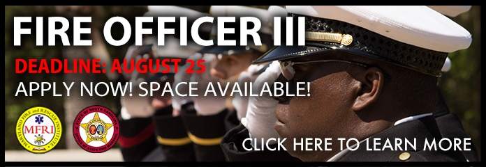 South Carolina Fire Academy is partnering with Maryland Fire Rescue Institute to offer Fire Officer III to members of the state’s fire service. The course dates include Sept. 25-29 (1st week) and Oct. 16-20 (2nd week).