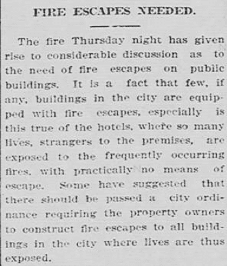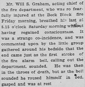 Ironically, as the firemen were returning from burying Chief Graham, a fire was reported. The baggage room of the Atlantic Coast Line Station depot was ablaze. “The department promptly responded to the call and despite the raw, rainy weather, battled with the flames practically the entire afternoon,” the newspaper said. Nearly 10 pouches of U.S. mail were destroyed, along with “many pieces of baggage.” No firemen were injured that day and, “Save the discomfort of wet clothing, the extreme cold weather, and ruining of many Sunday suits, the firemen came out of the incident unscathed,” the newspaper reported. An article, printed beside the story of his burial, reminded readers of the need for fire escapes as so many people are “exposed to frequently occurring fires.” (Watchman and Southron, Feb. 27, 1907)