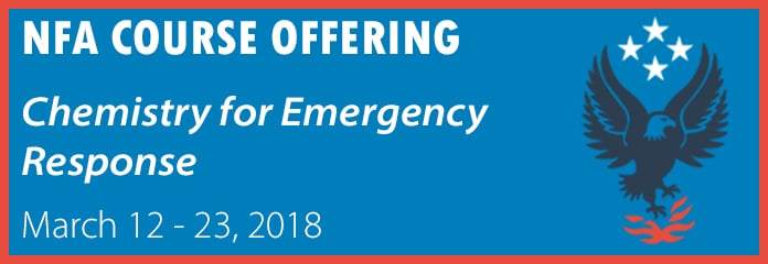 NFA’s Chemistry for Emergency Response March 12 – 23, 2018 8:30 a.m. – 5:00 p.m. SCFA Columbia Campus This free 10-day course is designed to prepare the responder to function safely at the scene of a hazardous materials incident by understanding the potential hazards. This is accomplished by gaining recognition of chemical nomenclature and basic principles of chemistry in order to assess risks to responders and the public. The course seeks to convey to first responders or prevention personnel a sound understanding of the basic chemistry of hazardous materials to permit them to correctly assess the threat posed by hazardous materials incidents that may occur accidentally or intentionally. Problem-solving sessions and interactive discussion cover topics such as salts and inorganic non-salts, hydrocarbons, hydrocarbon derivatives and hydrocarbon radicals. Applying the science of chemistry to thermodynamics, volatility and combustion provides real-world opportunities. An understanding of basic chemistry is helpful to receive maximum benefit from the course. Who should attend? This course is appropriate for emergency response personnel who have responsibility for analysis, management and/or tactical response to hazardous materials incidents, fire prevention inspectors, hazardous materials inspectors, regulators and planners where knowledge of the chemical behavior of hazardous materials is essential. Prerequisites