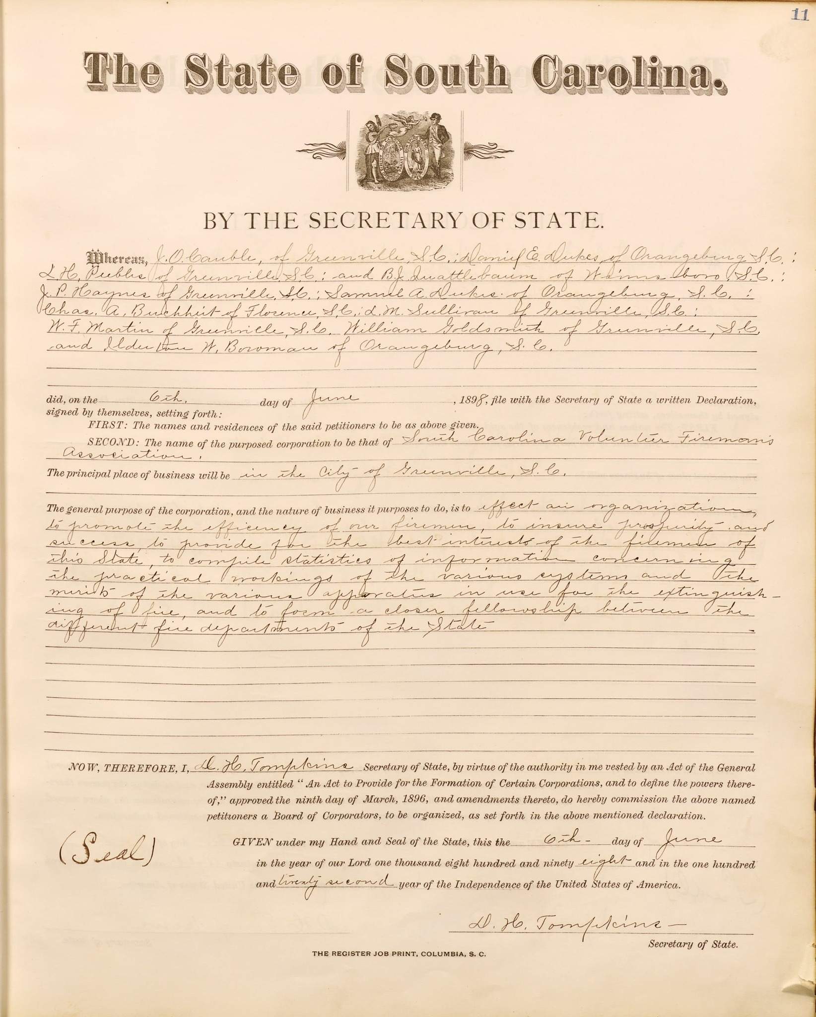 Soon after being employed by the Firefighters’ Association in 2014, this writer discovered at the State Archives a Petition of Incorporation for “The S. C. Volunteer Firemen’s Association”, dated June 6, 1898. It is petitioned by eleven (11) individuals, all fire service leaders residing mainly in Greenville and Orangeburg, with one each from Florence and Winnsboro. The petition is signed by D. H. Tompkins, Secretary of State.