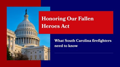 For South Carolina firefighters, the South Carolina Firefighter Cancer Health Care Benefit Plan has provided benefits to eligible firefighters diagnosed with qualifying cancers since it went into effect on July 1, 2021. An explanation of program benefits, beneficiary form, and the claim form are available online. The Honor Act does not impact benefits applied from the South Carolina Firefighter Cancer Health Care Benefit Plan.