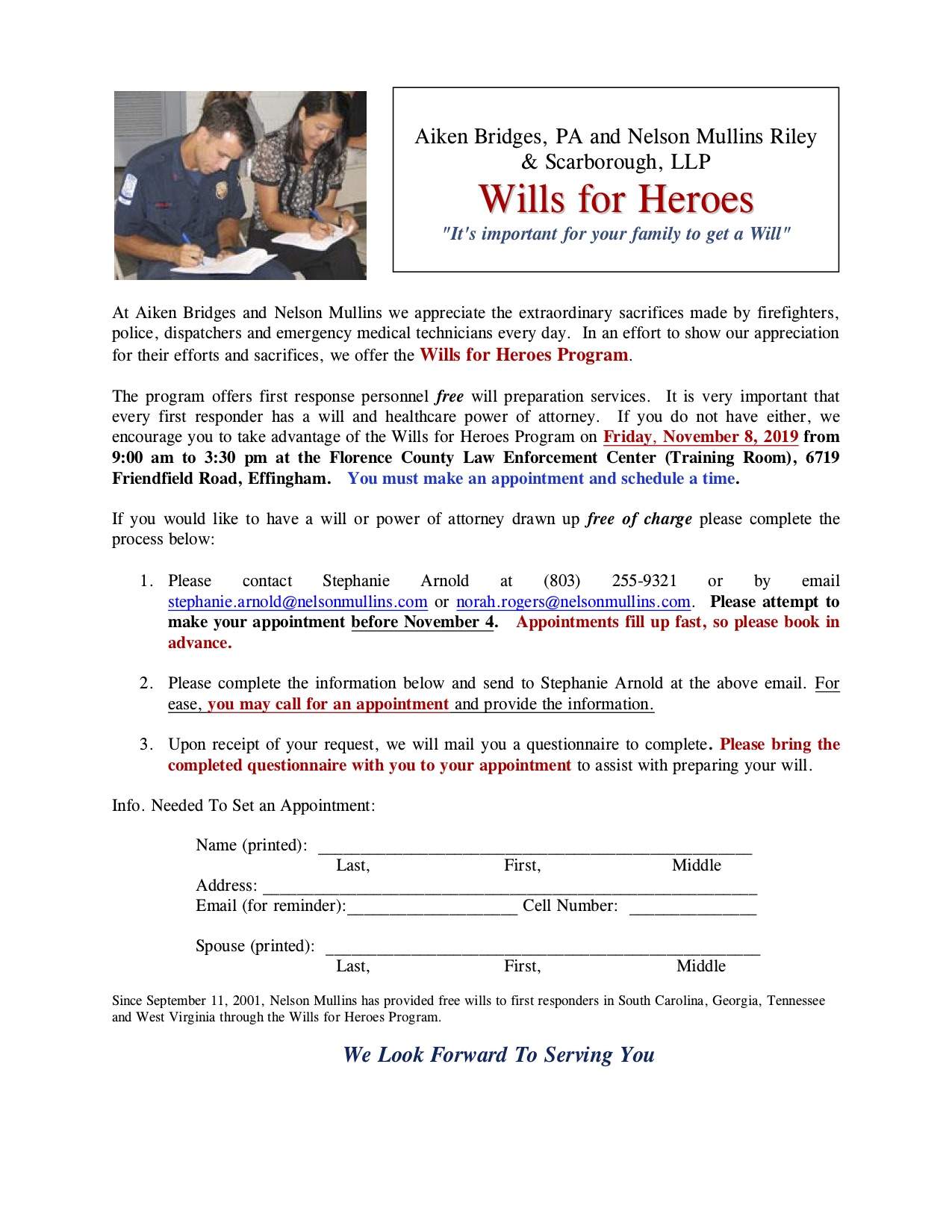 First Responders selflessly devote their lives to serving their communities and are prepared to pay the ultimate price in the line of duty. The relatively low number of First Responders with wills also speaks to the selflessness of First Responders; the very nature of the profession is to think of others first, to put the good of the community before themselves. Avoiding the thought of ‘what happens if I die’ is, for many First Responders, an occupational necessity. Shortly after the September 11, 2001, terrorist attacks, Anthony Hayes, a partner at Nelson Mullins Riley and Scarborough, LLP, in Columbia, South Carolina contacted the Columbia Fire Department asking what lawyers could do to help that department. During an impromptu focus group, it became clear that there was a glaring need for estate planning services. The Wills for Heroes program was born. Since then, Wills for Heroes programs in ten states have provided more than 7,000 free estate planning documents for First Responders. Because of the tremendous success of these programs, attorneys and bar associations across the United States started requesting assistance with implementing Wills for Heroes programs in their communities. In response, Jeff Jacobson and Anthony Hayes created the Wills for Heroes Foundation to oversee the nationwide expansion of these programs and connect volunteer attorneys with local First Responders. Click here to see information for the Florence County Wills for Heroes event: